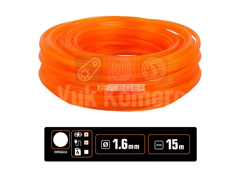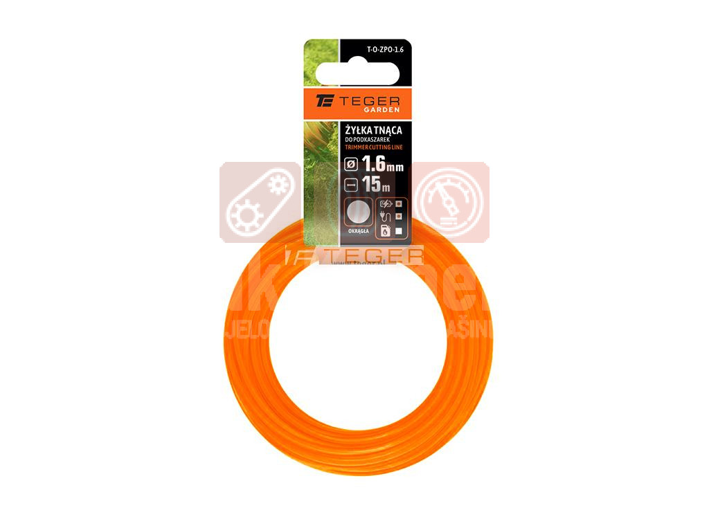 Linija za košnju za trimere /Okrugla / 1,6 mm / 15 m / TEGER je dizajnirana za trimere i električne motorne kose, još izdržljivije, otpornije i ne rastezljive. Ima odličnu snagu, što ga čini efikasnijim od običnih linija. Optimalni poprečni presjek linije osigurava ujednačene i efikasne performanse pri radu, materijal koji se koristi u proizvodnji linije je izdržljiv, čvrst i otporan na habanje. Poprečni presjek linije osigurava optimalne performanse trimera prilikom košenja.